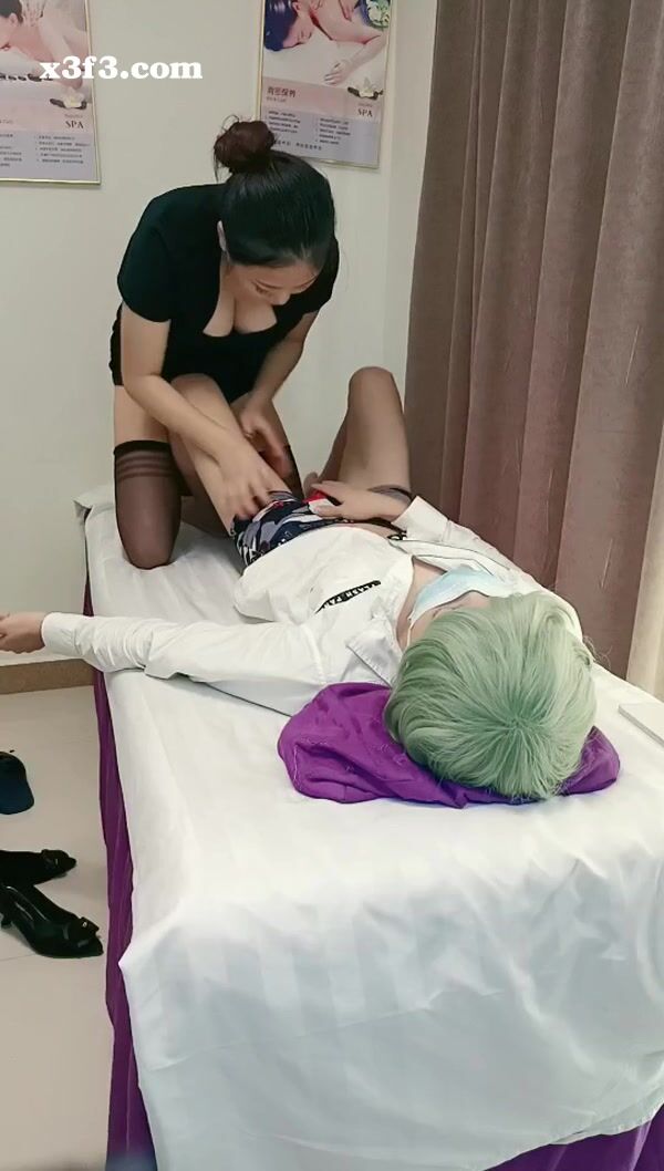 按摩店性感黑丝技师 勾搭顾客小哥的大鸡巴 扒下内裤口交 主动上位抽插好激情